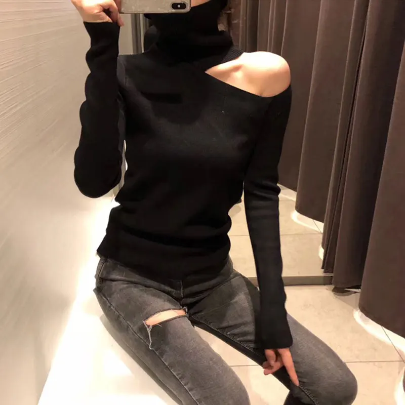 BEST QUALITY Knitted Sweater Off Shoulder Pullovers Sweater Women Long Sleeve Turtleneck Female Jumper Black Whi